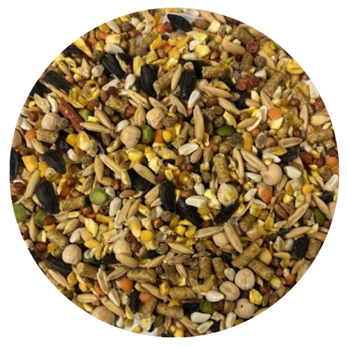 Cracked Corn, Recleaned Whole Wheat, Whole Oats, Recleaned Whole Milo, Canadian Trapper Peas, Ground Corn, Soybean Meal, Safflower Seed, Green Split Peas, Split Red Lentils, Wheat Flour, Black Oil Sunflower, Wheat Bran, Oyster Shell, Fish Oil, Fish Meal, Ground Barley, Calcium Carbonate, Whole Dried Whey, Ground Wheat, Suncured Alfalfa Meal, Corn Gluten Meal, Mono-Dicalcium Phosphate, Canola Oil, Brewer’s Yeast, Salt (Sodium Chloride), Linseed Meal, Feather Meal, Cane Molasses, Poultry Meal, Dried Saccharomyces cerevisiae Yeast Culture, Lignin Sulfonate, Iron Oxide, Mannan Oligosaccharides, Methionine Hydroxy Analog, Vitamin D3 Supplement, Propionic Acid (a preservative), L-Lysine Hydrochloride, Choline Chloride, Taurine, Shrimp Meal, Ferrous Sulfate, Zinc Oxide, Zinc Proteinate, Manganese Proteinate, Copper Proteinate, Cobalt Proteinate, Manganous Oxide, Lecithin, Anise Oil, Niacin Supplement, Vitamin A Supplement, Potassium Chloride, Vitamin C (AsPP L-ascorbyl-2-polyphosphate), Vitamin E Supplement, DL-Calcium Pantothenic Acid, Riboflavin Supplement, Vitamin K (Menadione Sodium Bisulfite Complex), Copper Sulfate, Vitamin B12 Supplement, Thiamine Mononitrate, Pyridoxine Hydrochloride, Biotin Supplement, Ethylenediamine Dihydriodide, Folic Acid, Ascorbic Acid, Sodium Selenite (Selenium), Cobalt Sulfate.