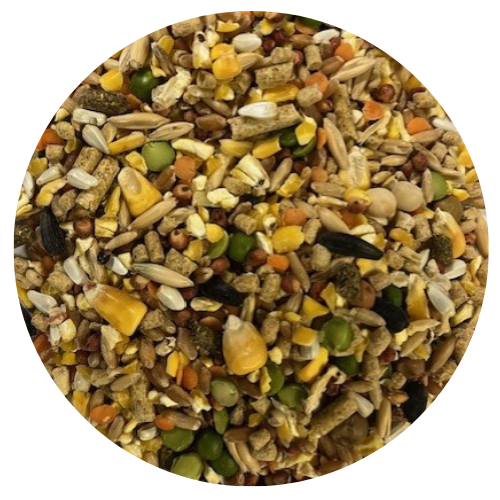A seed and grain mix with a high protein extruded pellet formulated for roosters.